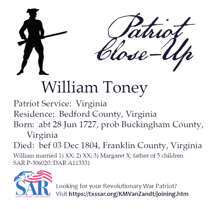 P-306020 / A113331 b. abt 1727 VA d. bef 1804 VA bur. in Toney Cem., Franklin Co., VA |